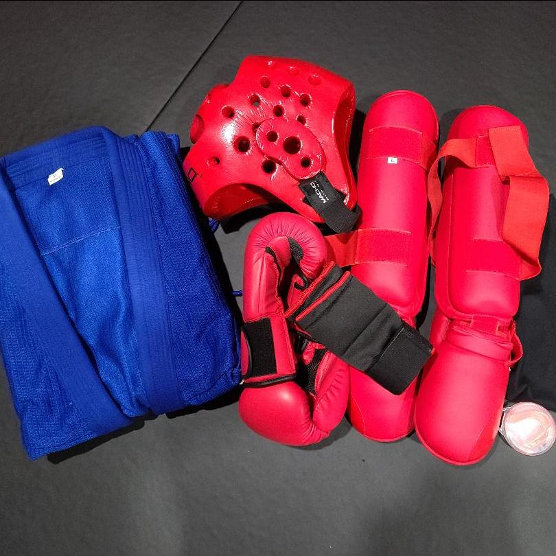 Everything you need to get started in Kickboxing and Jiu Jitsu: Jiu Jitsu gi, mouthguard, Boxing Gloves and quick wraps, shinguards, headgear, and a T - shirt.
