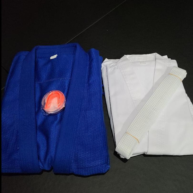 Everything you need to get started in karate & Jiu Jitsu: Jiu Jitsu Gi, Karate gi, MMA gloves, mouth guard, and belt for both disciplines.