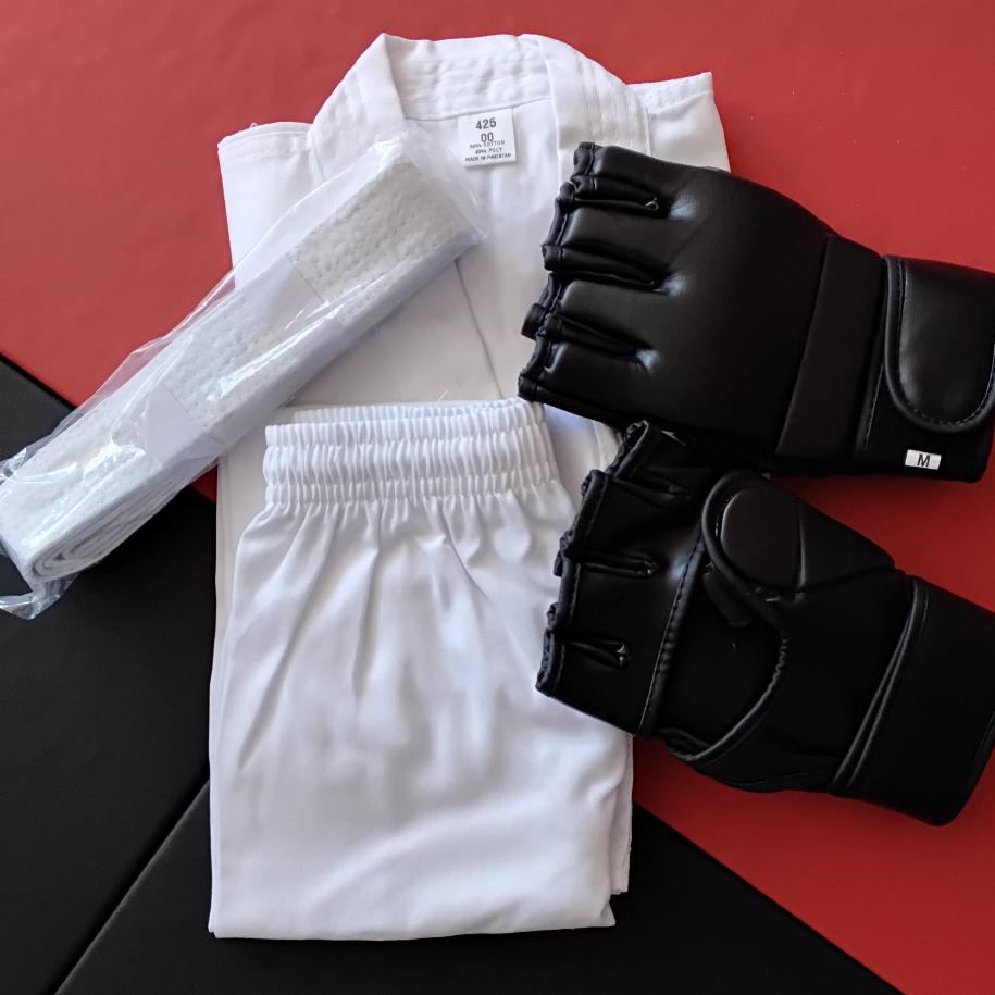 Everything you need to get started in karate: Karate Gi, MMA gloves, and belt.